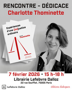 À l’occasion de la sortie du livre Expériences d’une (in)justice ordinaire, aux éditions Dialogues, de Charlotte Thominette, avocate au Barreau de Paris, la librairie Lefebvre Dalloz vous invite à une rencontre dédicace le samedi 7 février 2026 de 15h à 18h.